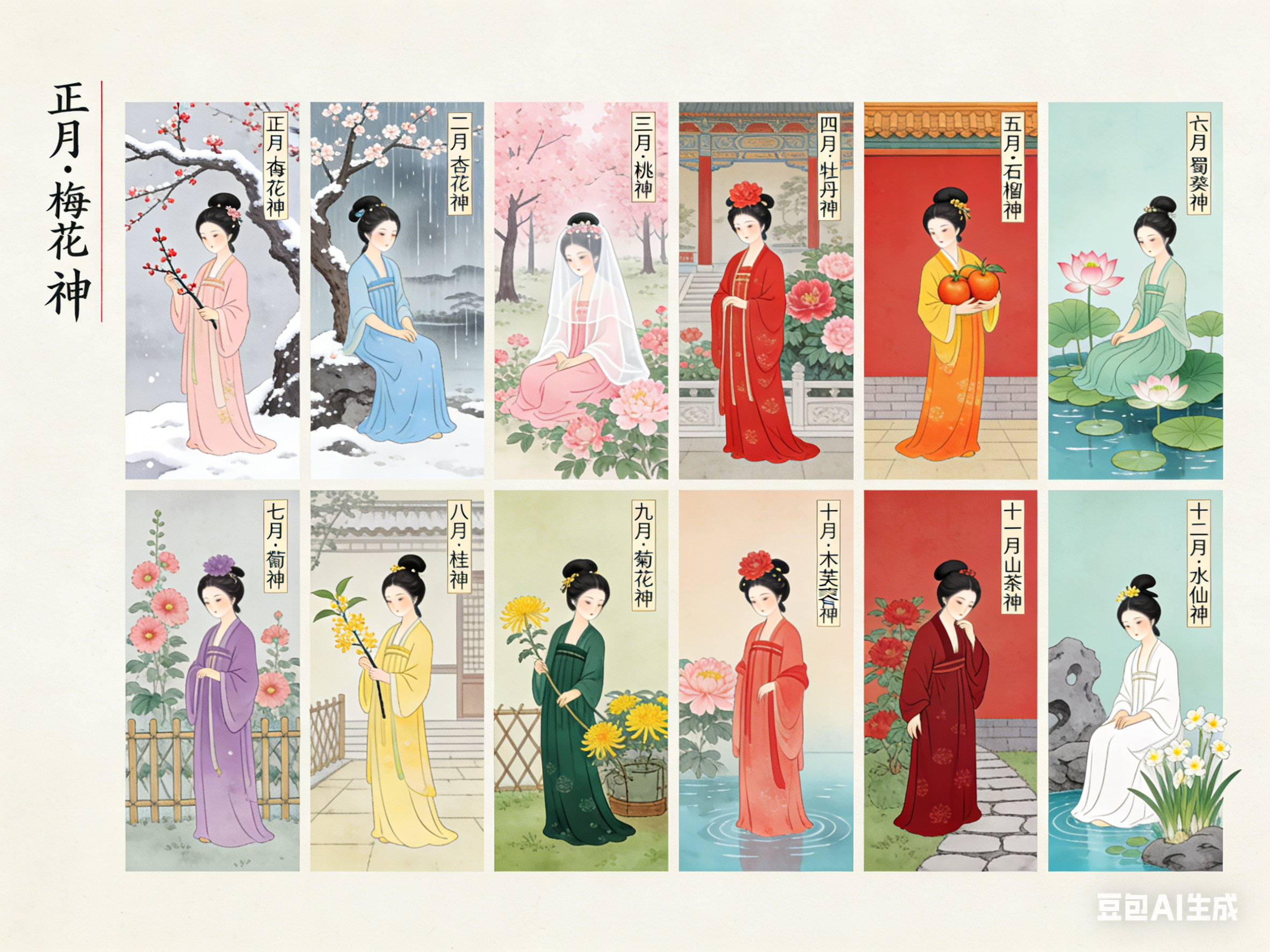 十二花神的核心,是一月一花,一花一神。基于识典古籍的权威溯源,结合明清以来的主流版本,以及2026年春晚《贺花神》的文化阐释,梳理出兼具文献依据与文化共识的正统谱系。以下以农历十二月为序,逐一解析花卉特质、花神人选、文献依据与月令内涵。