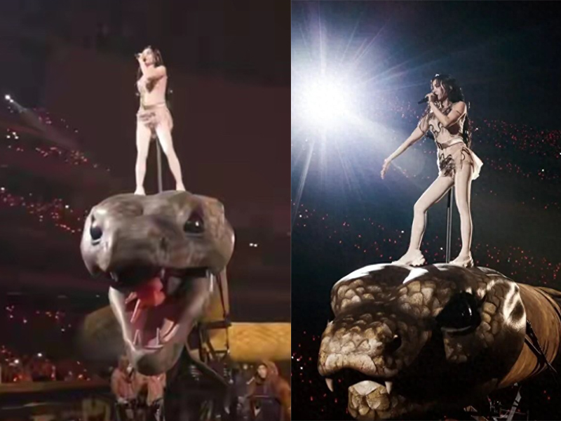 蔡依林站在30多米的机械巨蟒头上进行表演,张着血盆大口的蛇头足够吓人,有的观众觉得惊喜,有的观众可是被吓得够呛。