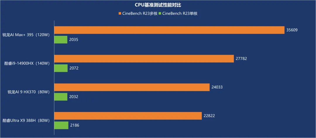 以CineBench R23的测试成绩,与酷睿i9-14900HX、酷睿Ultra X9 388H,锐龙AI 9 HX370进行横向对比,单核性能虽然相对一般,但多核性能却实现了屠榜,这意味着锐龙AI Max+ 395可以从容应对高负载的生产力应用场景。
