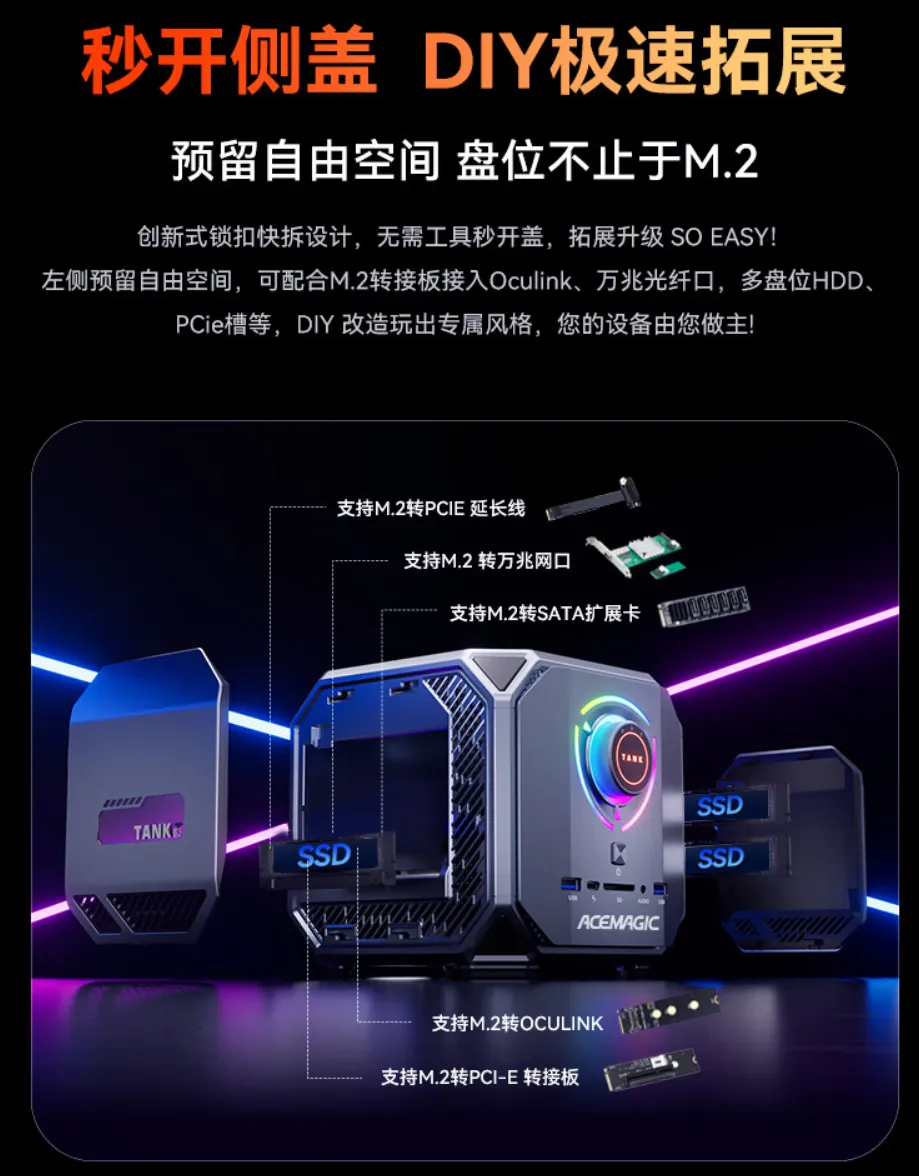 这里既可以加装SSD,也能换成M.2转OcuLink、万兆网口、SATA扩展卡等配件,扩展潜力一步到顶。