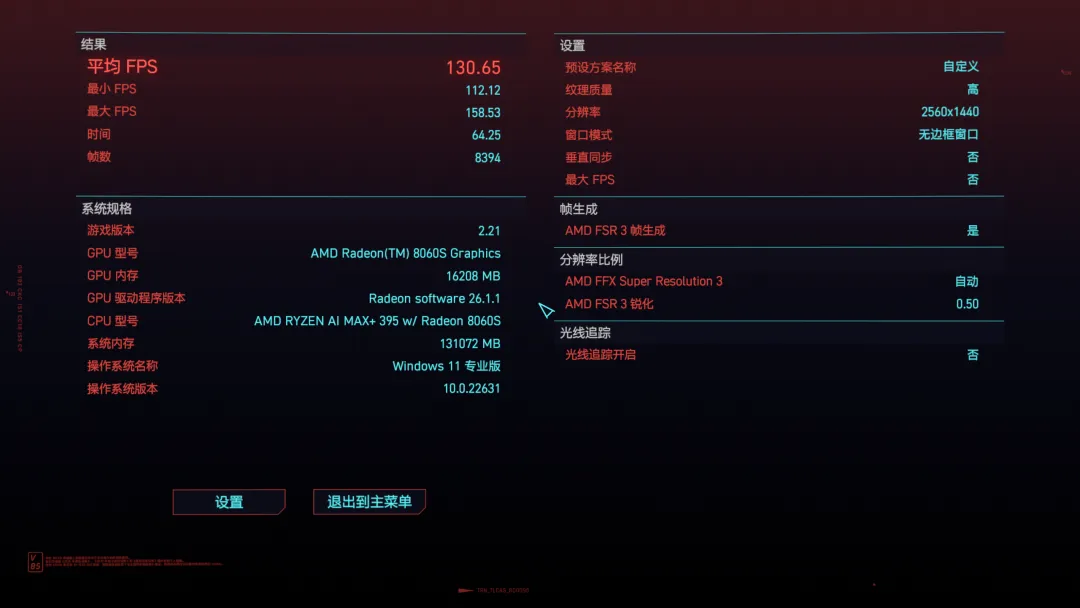 《赛博朋克2077》超级预设画质下平均帧数64.3FPS,开启帧生成后可涨至130.6FPS