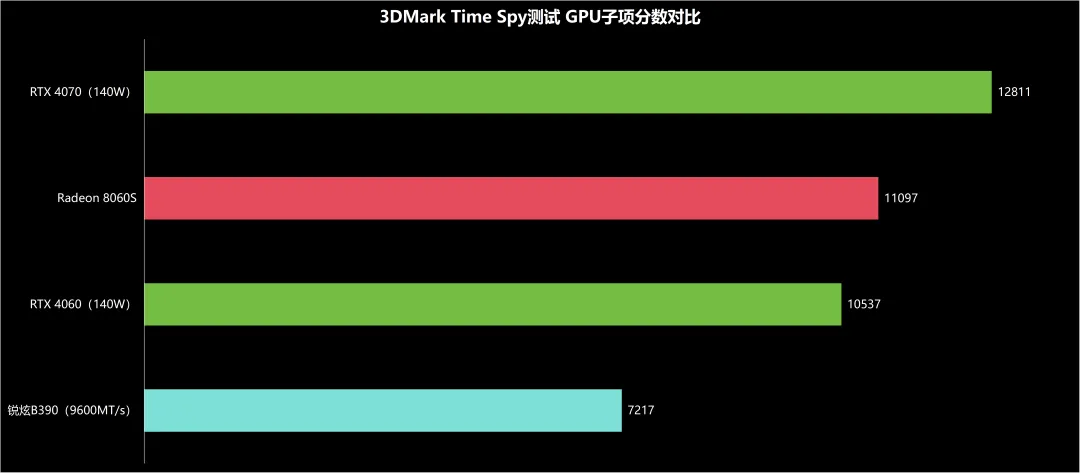 以Time Spy测试的GPU子项分数,与RTX4060和RTX4070移动独显,以及当下最热的锐炫B390核显(12 Xe3)进行横向对比,8060S的性能介于4060和4070之间,秒杀锐炫B390,最强集成显卡之名果然名不虚传。