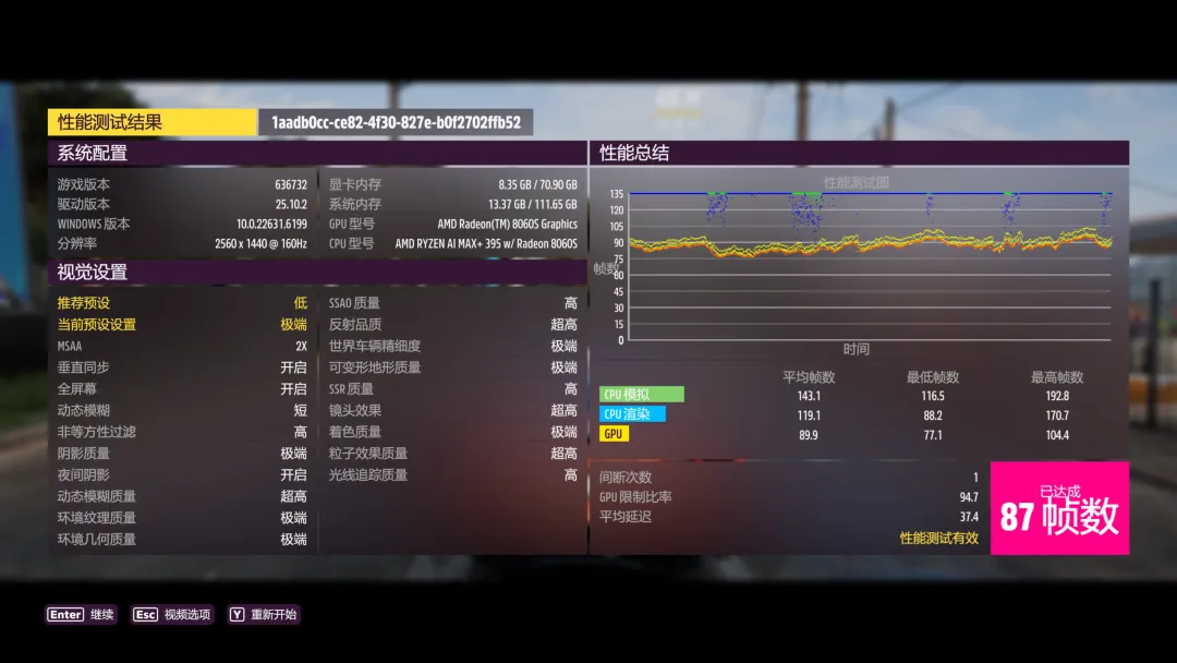 《地平线5》极端画质下平均帧数87FPS