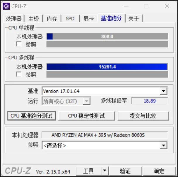 处理器性能方面,CPU-Z测试,单核808,多核15261