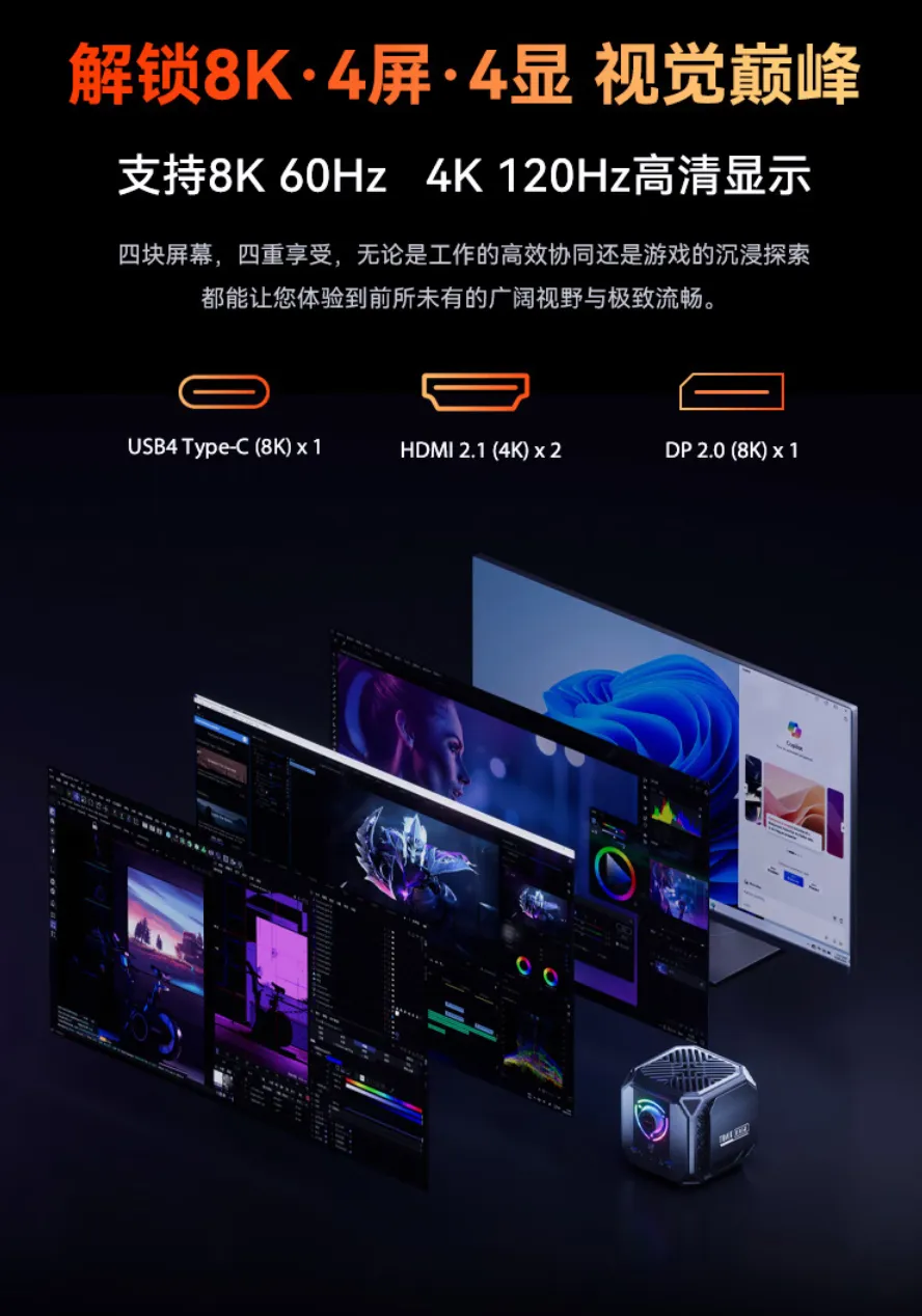 2个HDMI、1个DP和1个USB4,共计4个视频输出接口,这意味着该产品可以实现四屏异显,无论是专业创作还是期股交易,都能利用多屏提升效率。