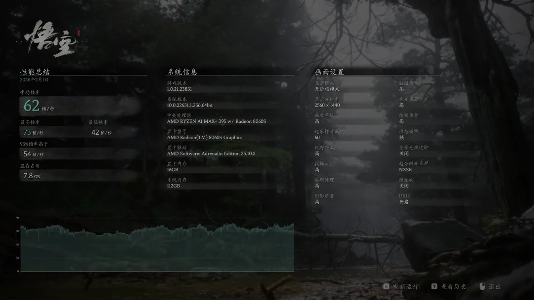 《黑神话悟空》超采样清晰度60,高预设画质平均帧数62FPS,开启帧生成后帧数提升到86FPS