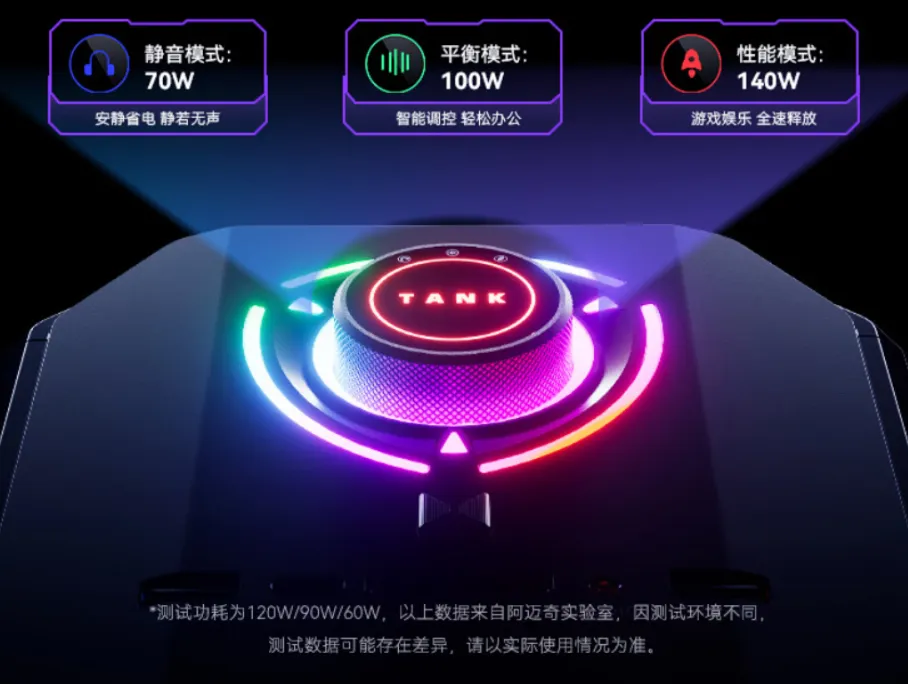 机身正面嵌入了一个带有类似腕表刻纹的旋钮,由左到右旋转就能在静音模式,平衡模式和性能模式间切换,无需重启进入BIOS修改设置。而且每种电源模式都还有对应颜色的呼吸灯效,每逢旋转到位都有清脆的咔哒声,仪式感十足。