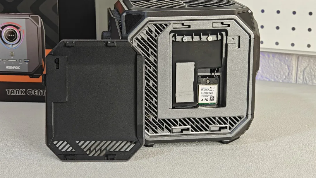 机身右侧,配备了2个M.2硬盘位,靠右侧硬盘位下方则是MT7925无线网卡,支持Wi-Fi 7和蓝牙5.4。