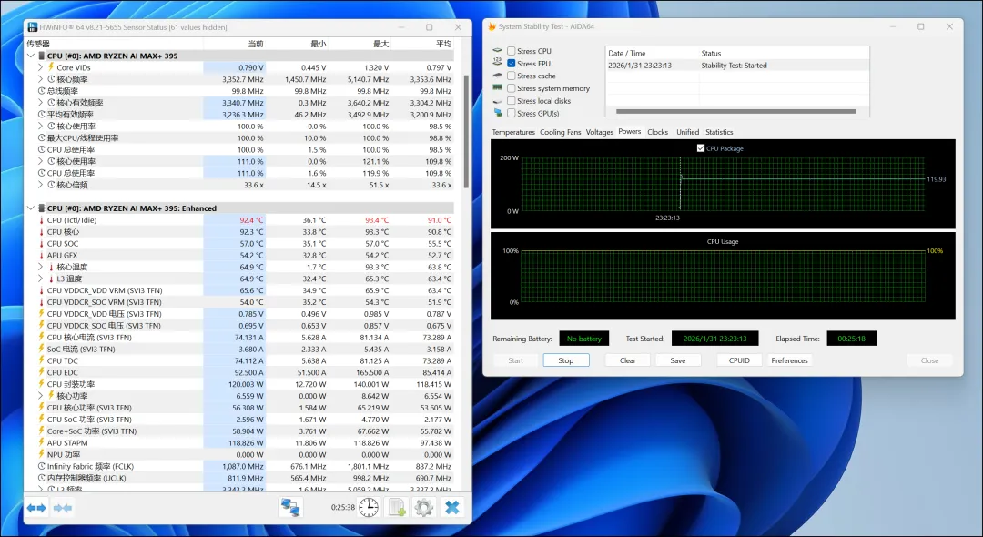 在跑分之前,咱们先来看看阿迈奇M1A Pro+的烤机和温度噪音控制情况。在室温26度,性能模式下运行AIDA 64的烤机测试,其处理器的初始峰值功耗可达140W,随后会下降并稳定在120W一条直线上,CPU温度约92℃,主频3.35GHz左右。