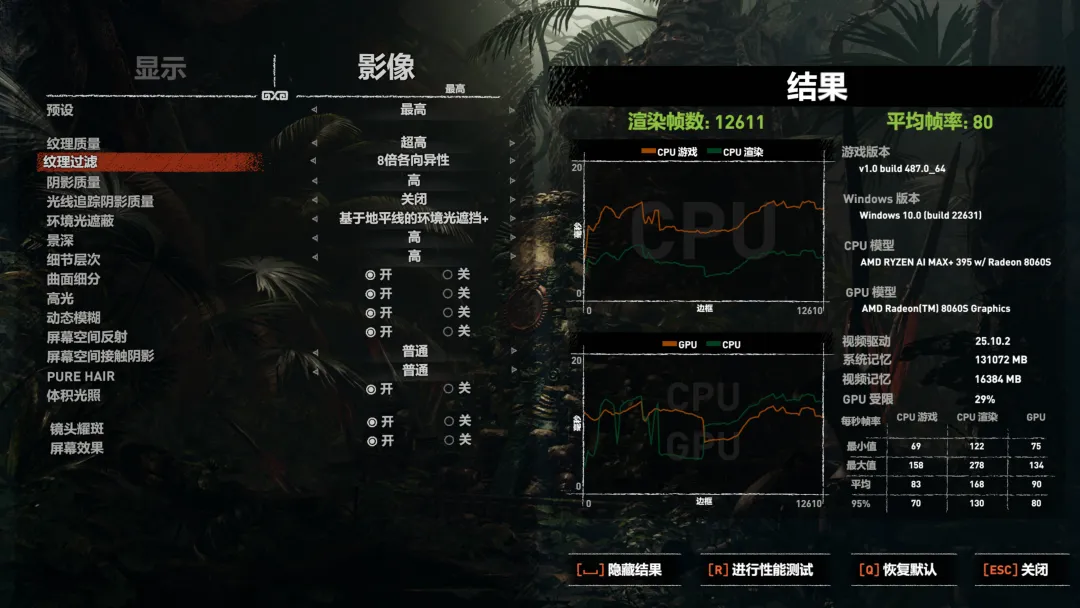《古墓丽影 暗影》最高画质下平均帧数80FPS