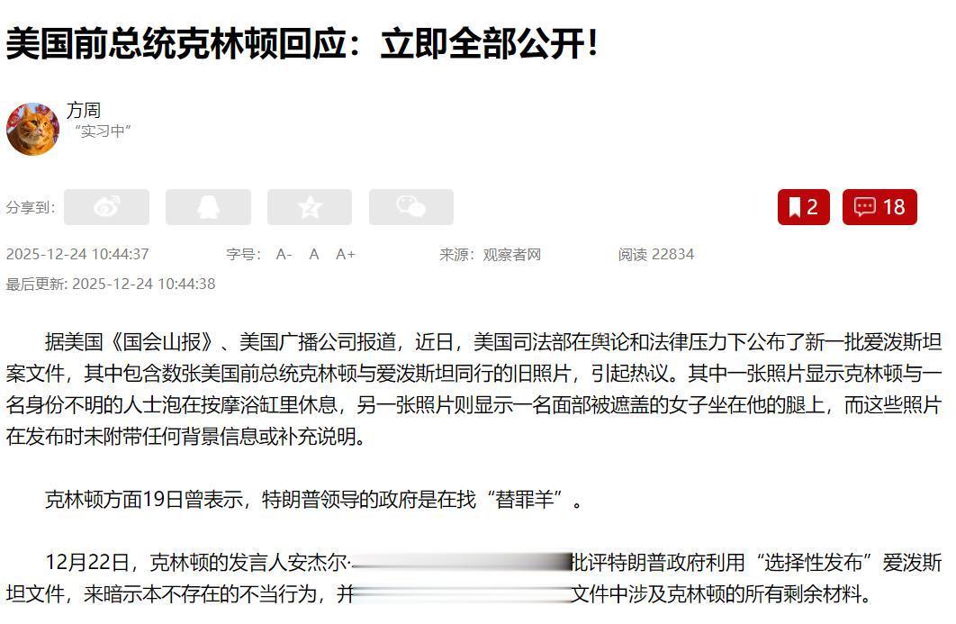 他还明确划分了两类人,一类人在爱泼斯坦犯罪曝光前就断了联系,克林顿属于这类人。