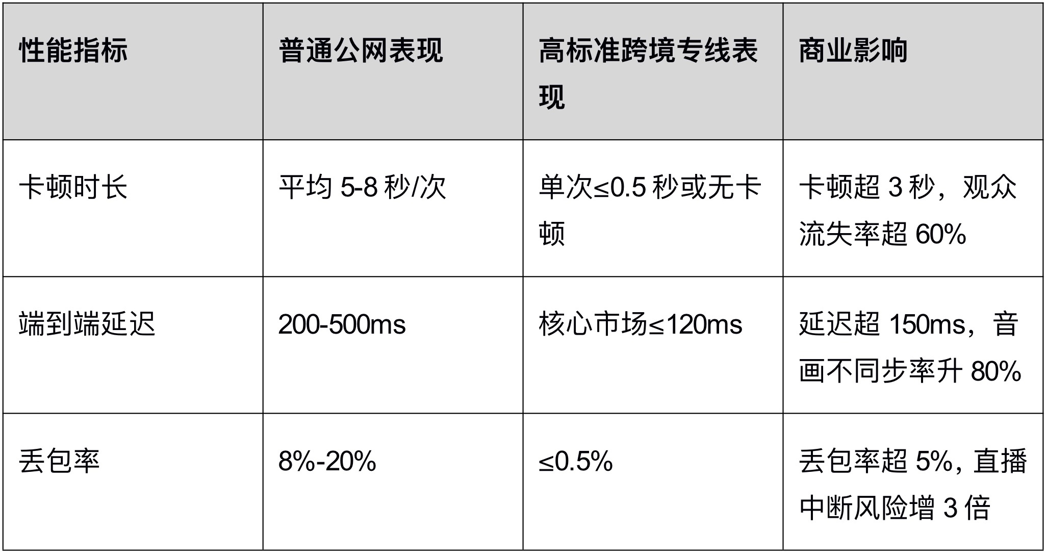 跨境直播对网络的要求堪称“毫秒级”,其实时互动性、画面连续性直接决定商业转化效果,普通网络与高标准专线的差距在此被无限放大。行业权威调研机构IDC 2025年数据显示,网络性能对直播关键指标的影响呈现显著差异: