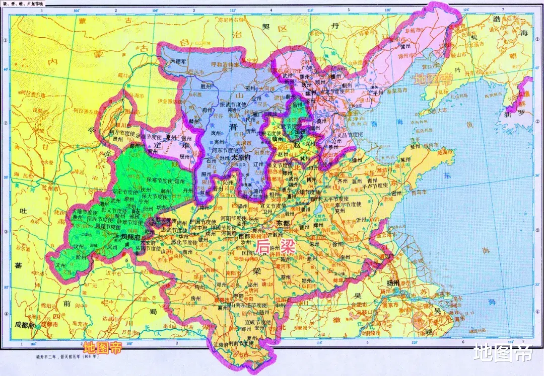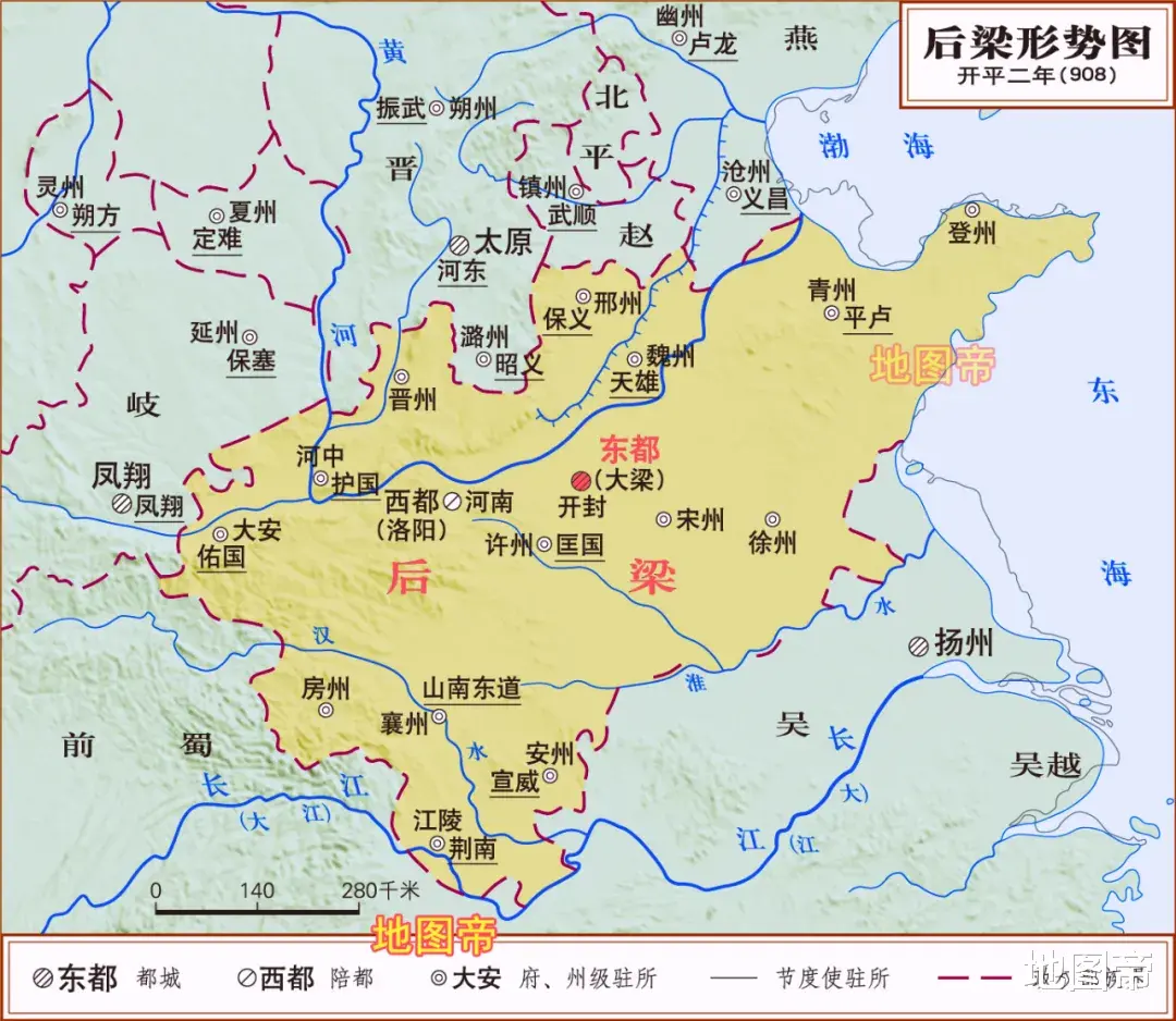 后梁南部到淮河就戛然而止了,北边不控制幽州(今北京)、晋阳(今山西太原),西部虽然占据长安,但未能控制关中西部的凤翔(今陕西宝鸡)。