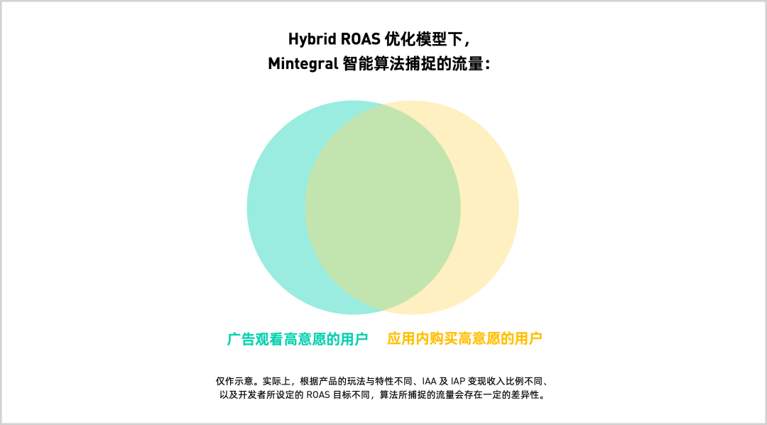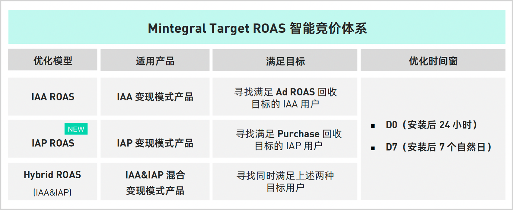 它不仅能围绕广告主设定的ROAS(广告投入回报率)、CPE(每次互动成本)等关键目标,持续优化广告投放效果,提升投资回报;还支持以应用内广告(IAA)、混合变现(Hybrid)和应用内购买(IAP)为变现核心的游戏和非游戏应用进行投放,可满足各类型广告主的多样化投放需求。