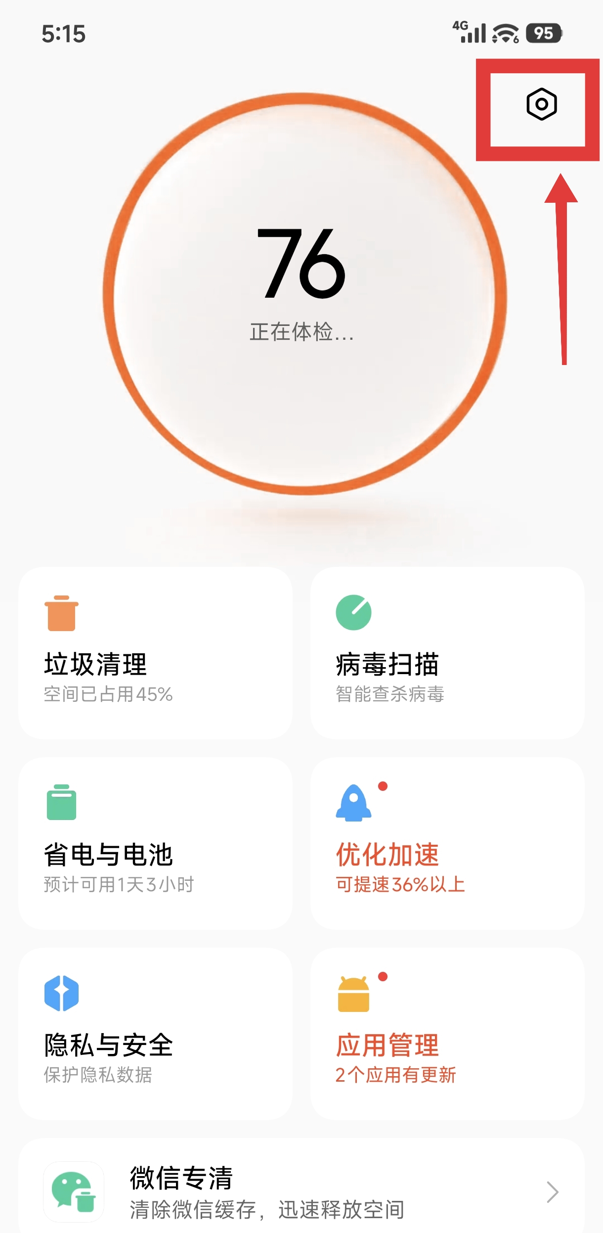 2.进入到手机管家主页面后,点击右上角的设置图标。