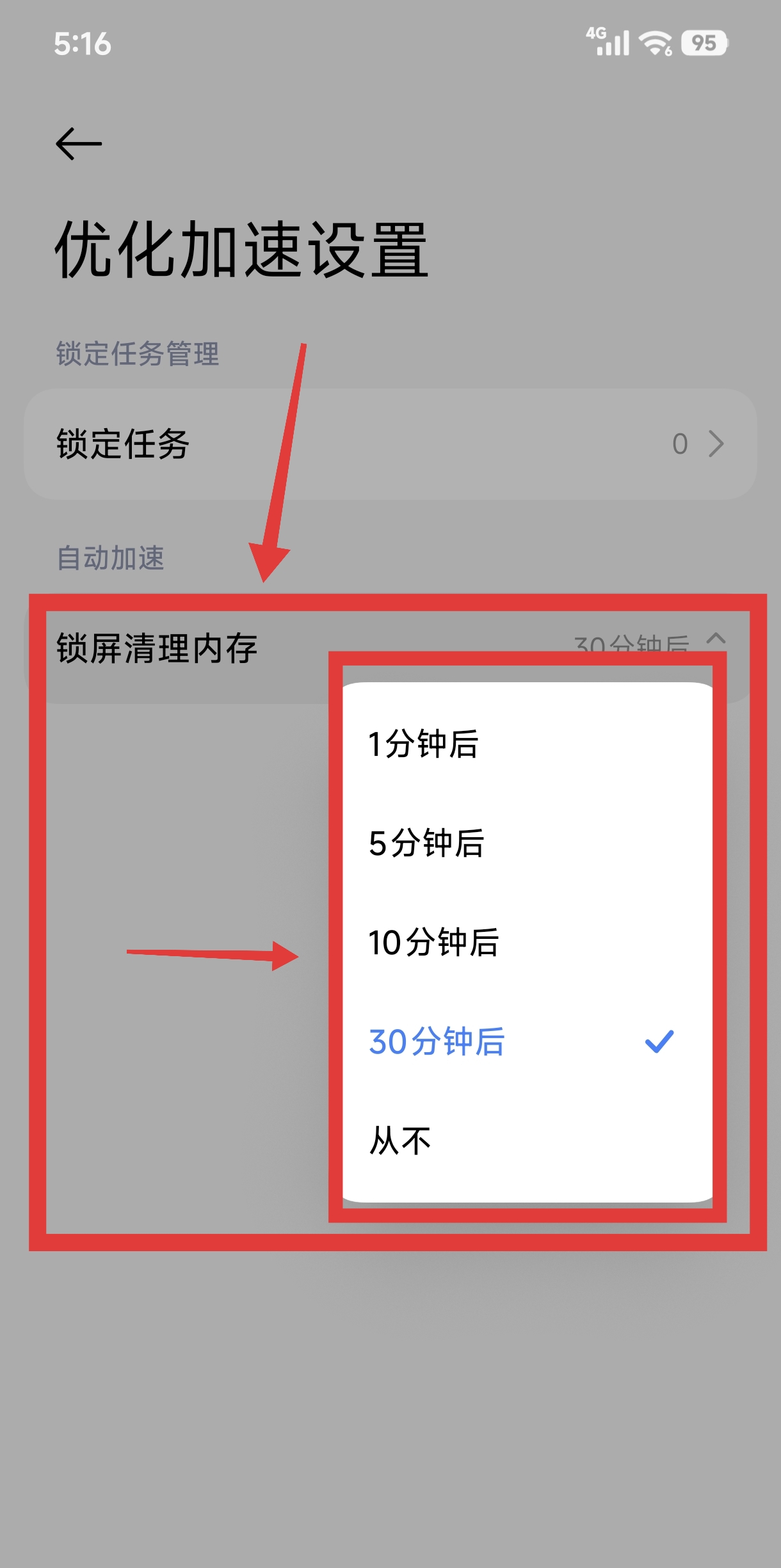 4.进入到优化加速设置页面后,找到点击【锁屏清理内存】设置时间即可了。