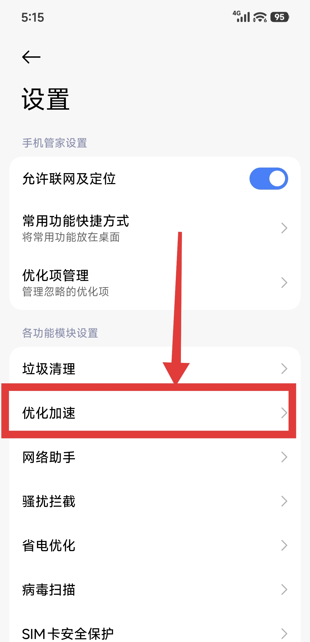 首先打开小米手机手机管家。2.进入到手机管家主页面后,点击右上角的设置图标。3.进入到设置页面后,点击【优化加速】。4.