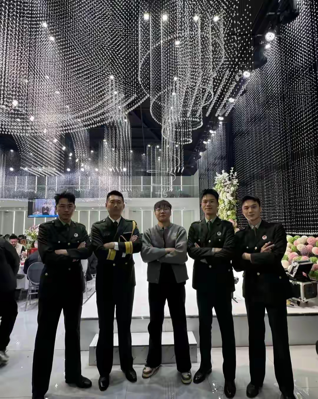 一群穿着军装的年轻人整齐列队站在会场入口。这些都是张自轩当年的战友,专程从全国各地赶来参加婚礼。
