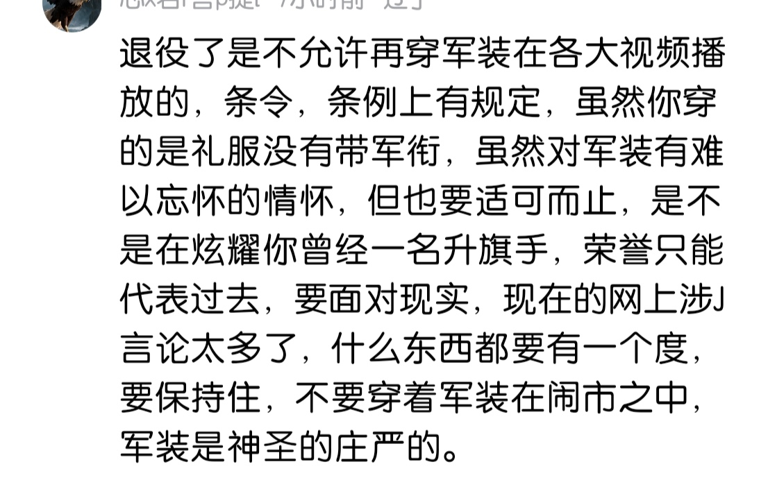 有人在刷祝福,有人在质疑他穿常服的行为。有条评论特别刺眼,退役了还穿什么军装,这不是在消费军人身份吗。
