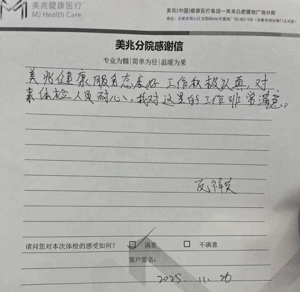 “工作积极认真” 是孔女士对工作人员的另一大印象:“不管是引导员、护士还是医生,都各司其职,做事效率很高,不会让顾客长时间等待。而且整个分院的氛围都很温馨,装修简约大气,没有医院的压抑感,让人感觉很舒服。” 这份不加修饰的认可,正是美兆分院用日复一日的真诚服务,换来的 “合肥高品质体检中心” 口碑。