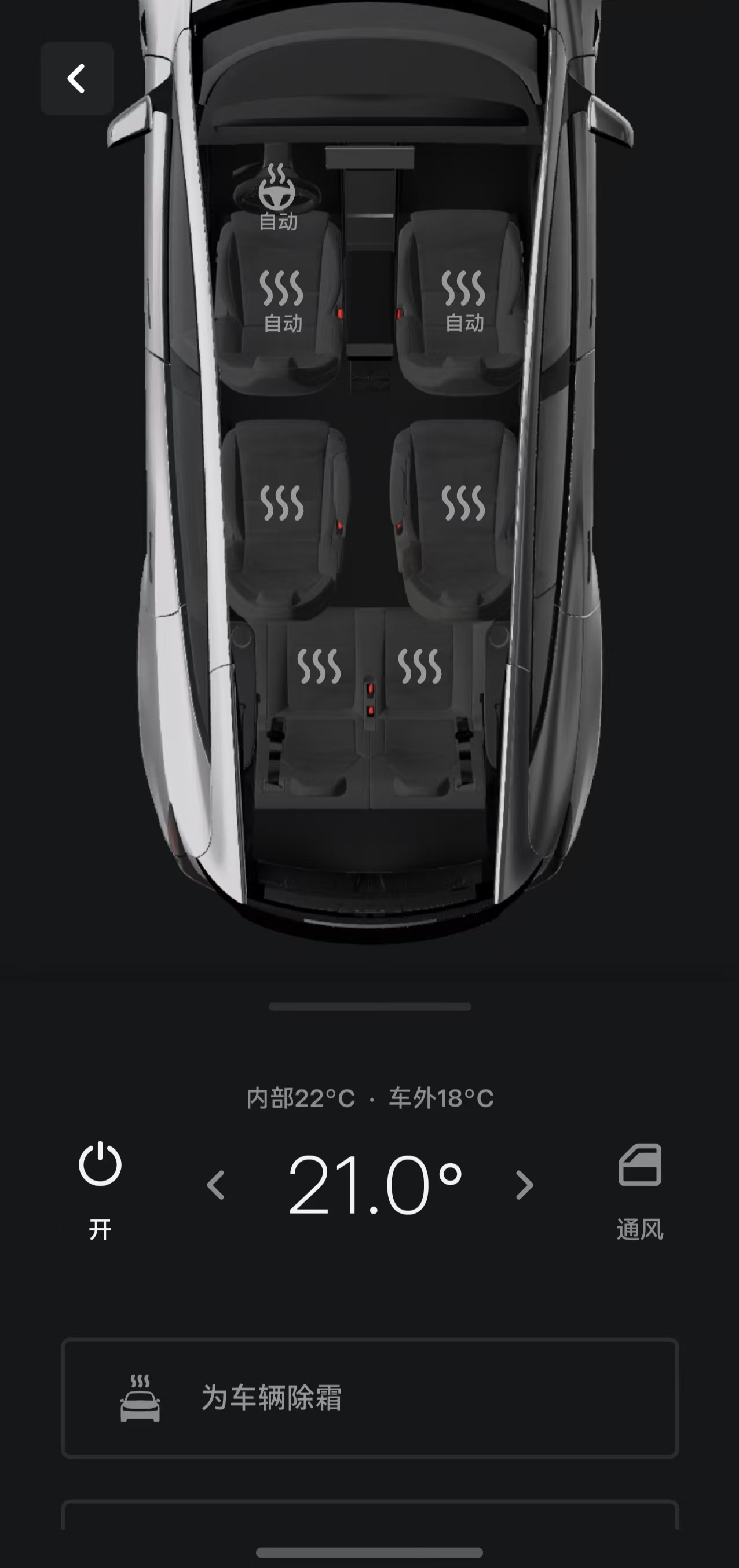 座舱环境预调节:出发前可远程预热或预冷座舱,并支持座椅加热、方向盘加热等功能,即便车辆停在封闭车库也能正常使用,寒冬、酷暑等天气也能上车即享舒适温度。
