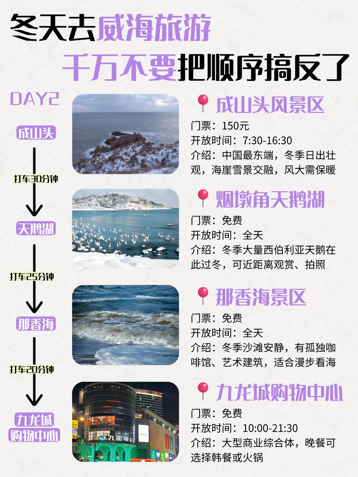 📍第二天:成山头风景区 → 烟墩角天鹅湖 → 那香海景区 → 九龙城购物中心