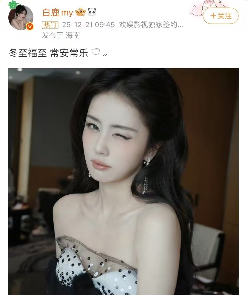 娱乐圈里明星们也在晒冬至美照,白鹿起早撸了一个美美哒的妆,因为还要赶工作,就直接发了祝福。