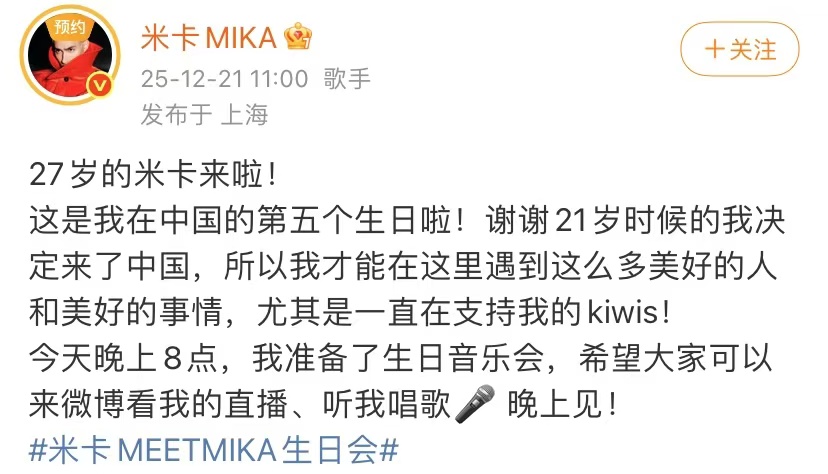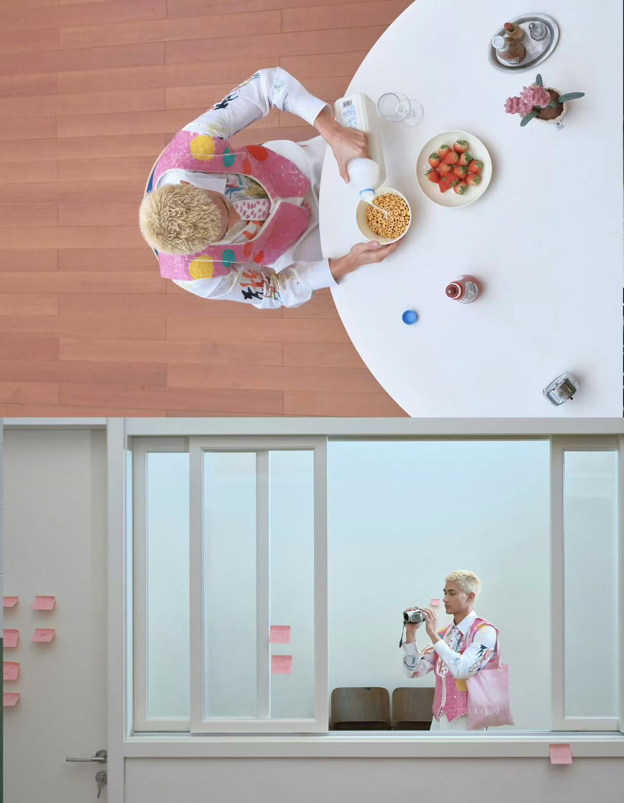 米卡的生日特别有意思,跟冬至是同一天。27岁的生日他选择了以红白彩色为主题,拍了一组非常有童趣的照片。