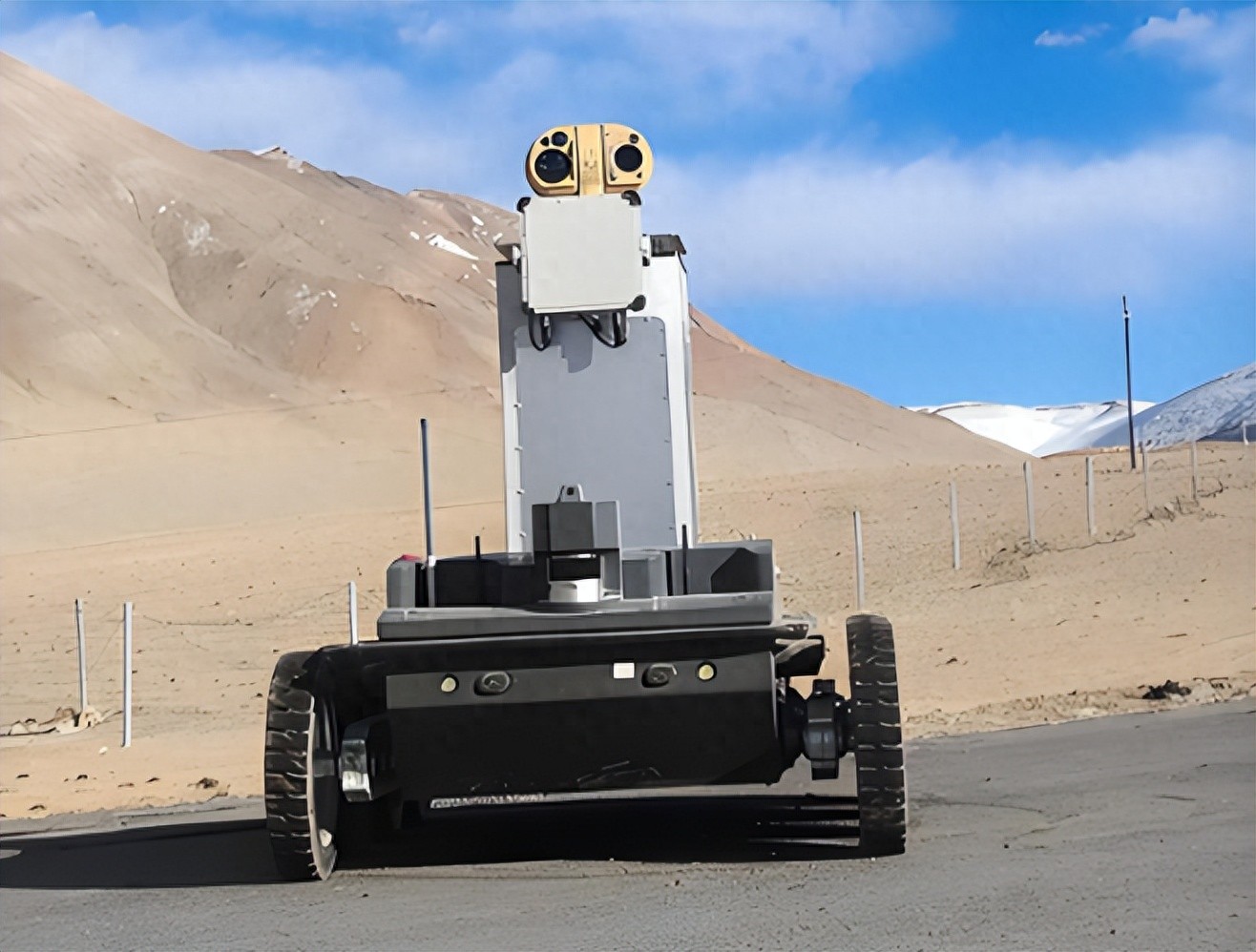 从外观上看,这台巡逻机器人配置较为简单,它采用了履带式底盘,上面配备了一个球形的光电云台。由于拍摄角度和清晰度问题,不太能看清它是否装备了武器。这台巡逻机器人主要任务,大概率是沿着中印边境进行往返的定点巡逻。从结构和用途方面分析,它确实比较简单。