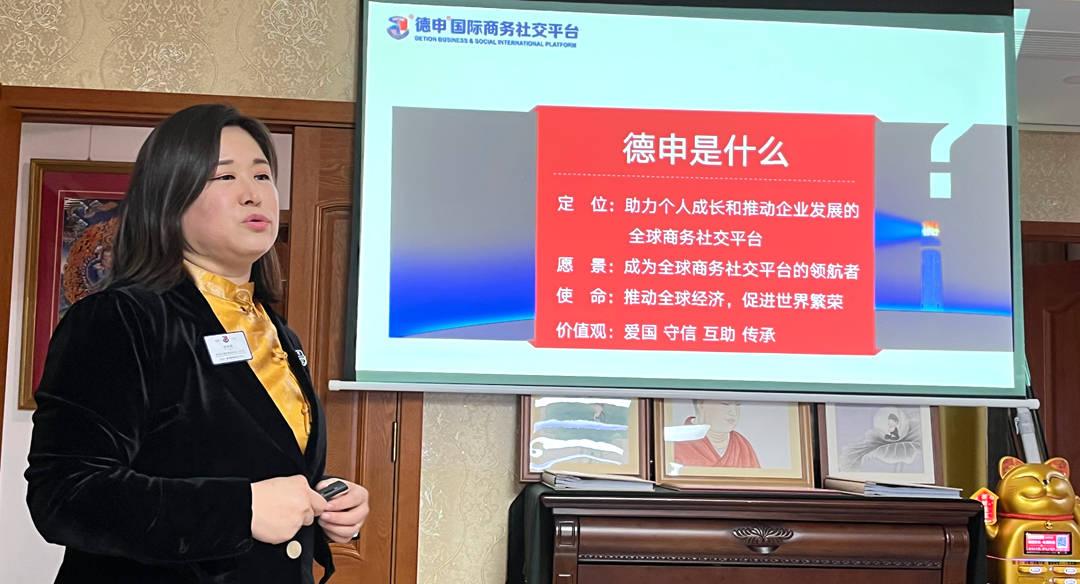活动在德申宣传片的播放中拉开帷幕。宣传全面展现了德申作为全球商务社交平台的清晰定位与崇高使命。同时,“爱国、守信、互助、传承” 的价值观也通过宣传片深入传递给在场的每一位嘉宾。