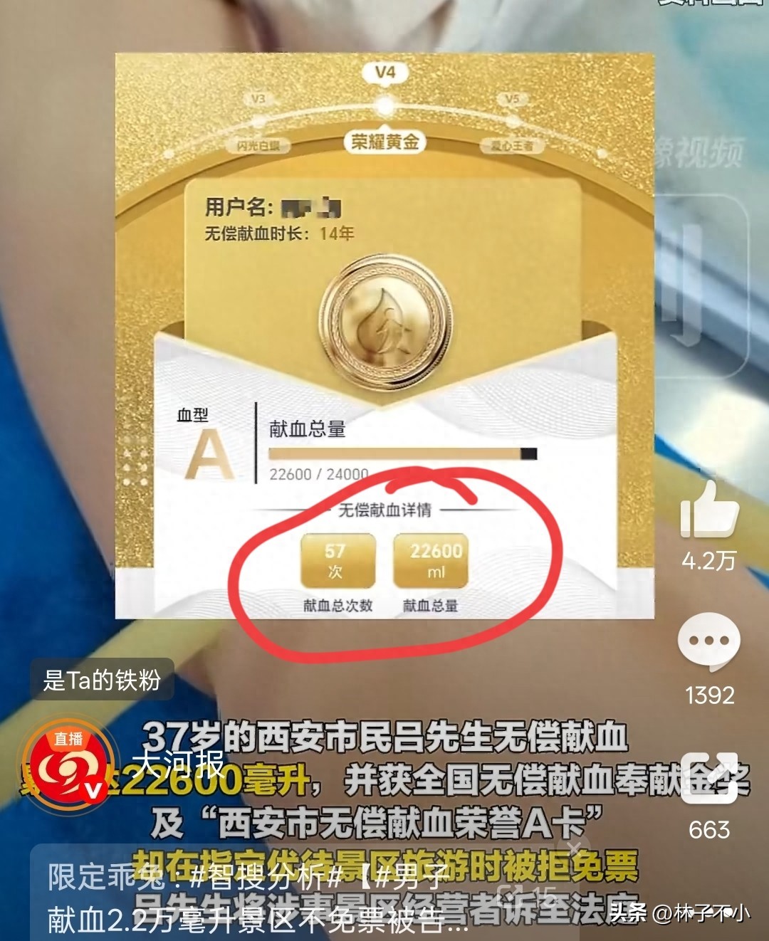 2025年12月21日,吕先生带家人前往西安某景区游玩时,他向景区的工作人员出具了自己献血荣誉A卡以及自己的身份证,想通过这种方式申请免去门票。