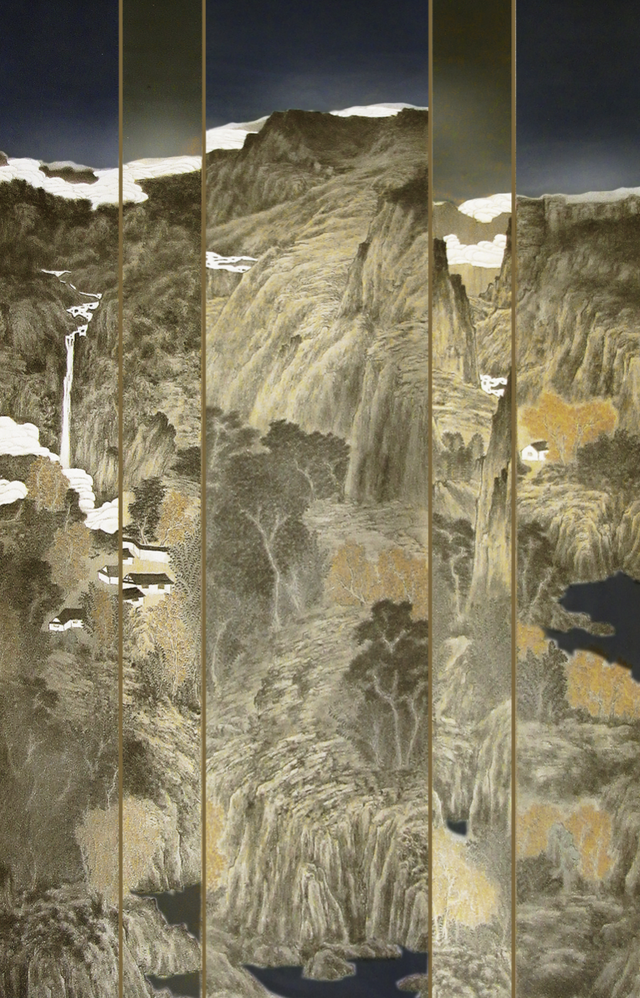 黑是我的作品的特点,也是亮点。我作品的黑,不干不燥,看上去很油润。在我的笔下,山崖虽高峻,但不会给人以压迫感,林壑虽繁,但不会给人以闭塞感。我在构成上,常借鉴西画和版画的艺术特征,来增强画面的时代感和可读性。画眼的安排,主题部分的刻画尽量细腻,一般会安排三到四个留白,留白的面积大小,位置的安排,所表现的对象都需匠心经营的,都是为了突出画面的节奏感和韵律。