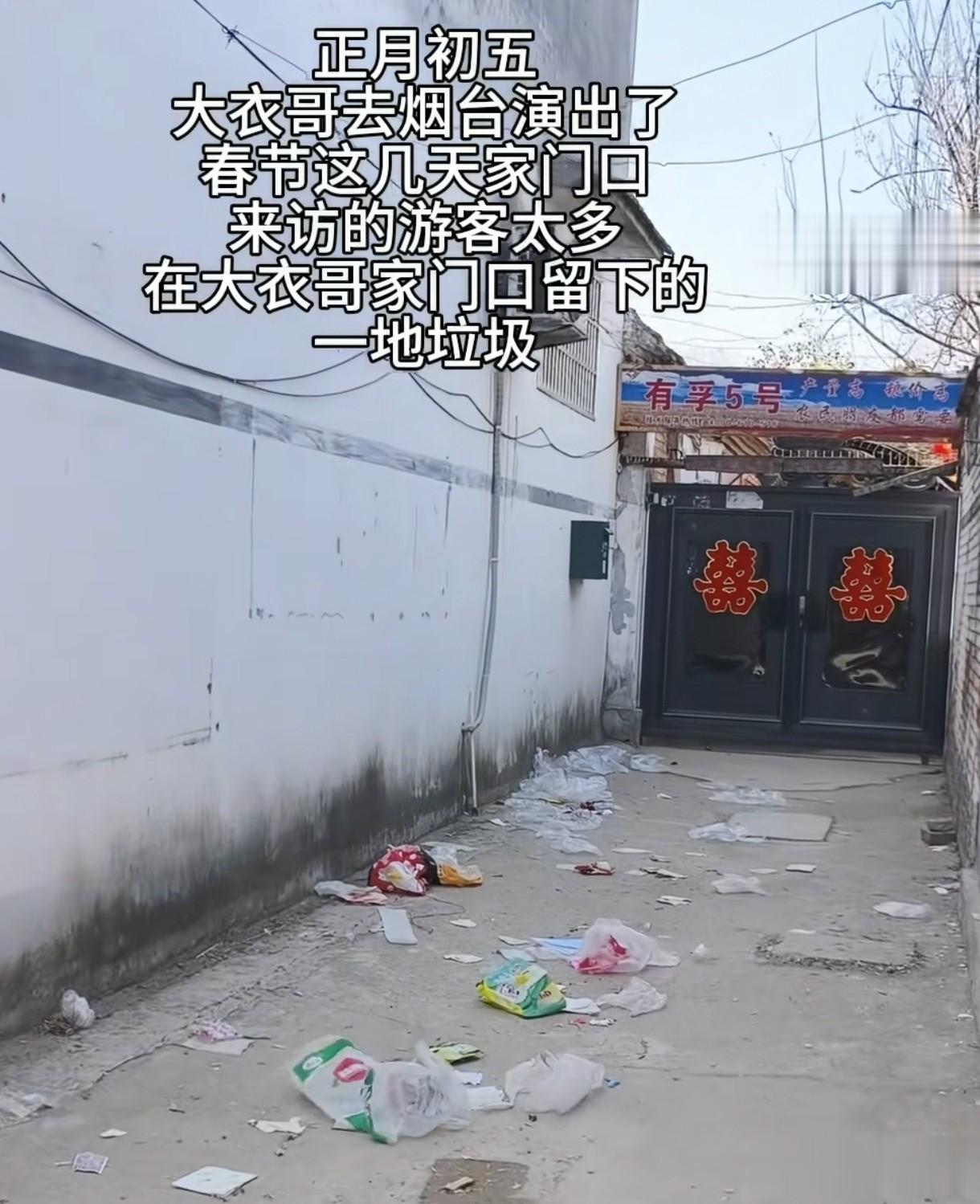 大衣哥离开家去了烟台,家门口却一片狼藉。这几天他家门口天天人头簇拥。看热闹的、借钱的,请求大衣哥帮忙的,各种各样的人,形形色色的人,都想在大衣哥身上分一杯羹。