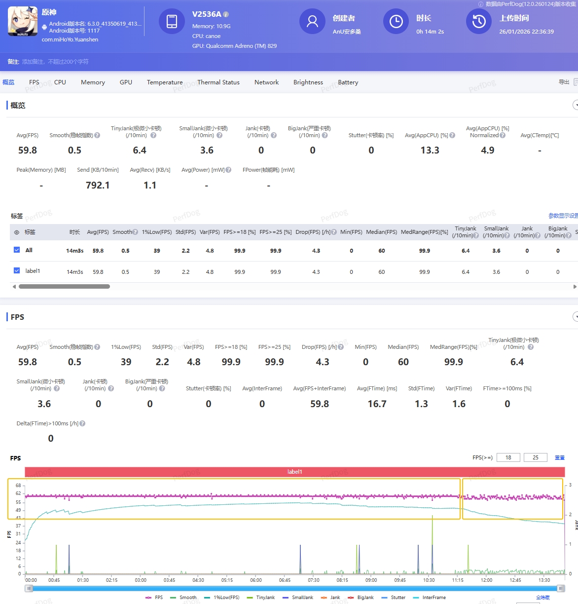 而原神也是稳定在60帧的情况下,虽然一段时间后也就是第11分钟以后才会有一定的细微波动 ,但是整体还是非常不错的反馈,整体的使用过程中没有出现任何卡顿或过度发热的情况,“冷静”如初。