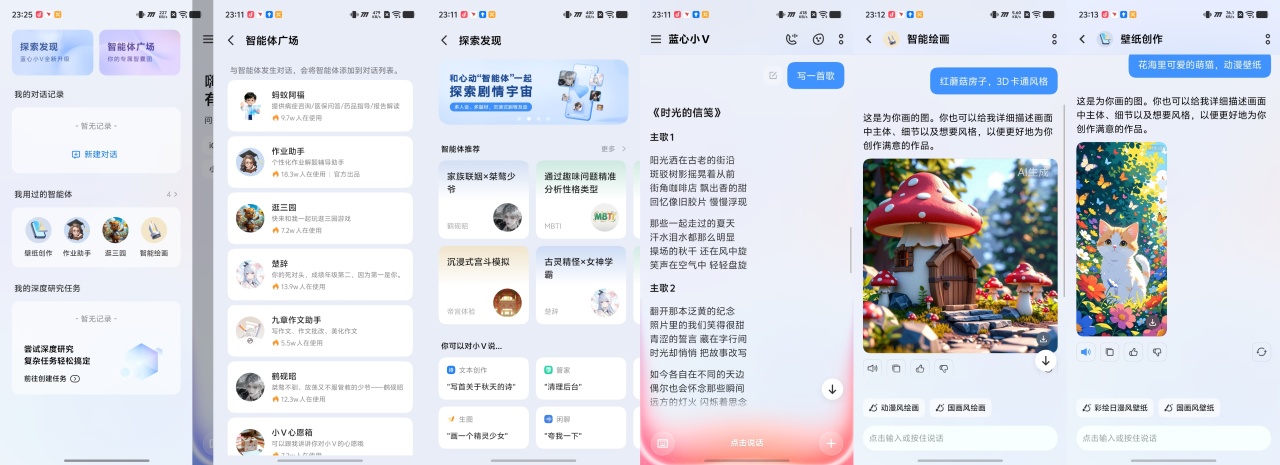 说到AI,本来前面影像要讲的,在这个系统,我觉得它首先服务于图片的调节,然后再来讲其他,蓝心小V的智能体广场应用场景非常地广泛,日常做简单的医疗咨询(注意是咨询并非问诊)、作业助手、写文章、写报告、智能绘画、运动教练,它都非常在行,真有一种面面俱到的感觉。