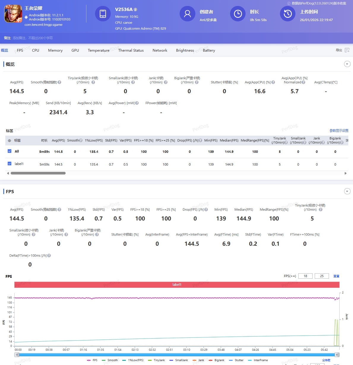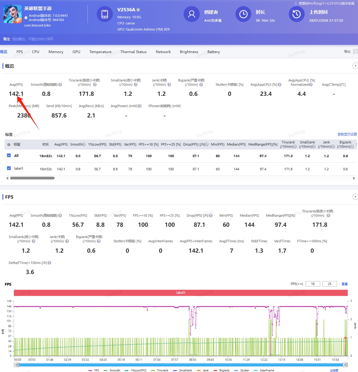 同样144高刷给到的还有《英雄联盟手游》,不过在游戏的过程中,出现了几次波动,不过全程体验还是非常丝滑,平均帧率达到了 142.1Hz的不俗成绩。