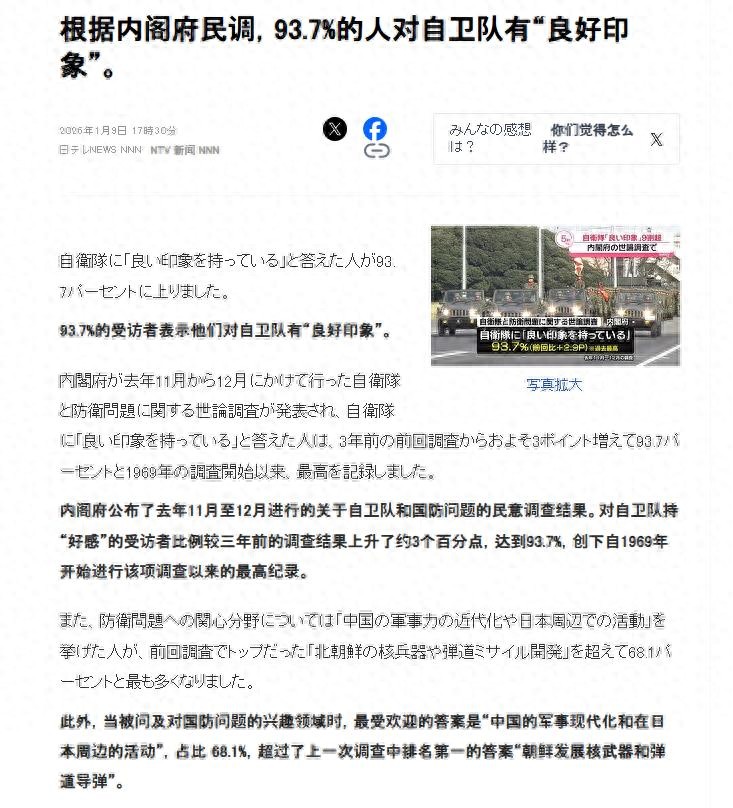 93.7%!日本自卫队喜提 1969 年有统计以来最高支持率,自高市早苗上台后这一数据飙升,日本舆论场彻底沸腾。