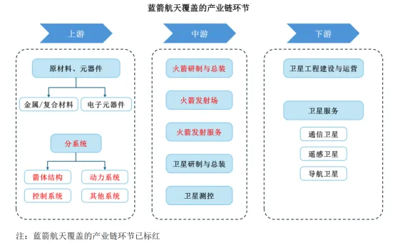 上中下游企业依托该场景形成协同关系:上游提供原材料/元器件/分系统,中游负责总装集成、发射执行与运营,下游承接应用需求与终端服务,各环节的合规义务与合规风险沿业务流程传导、各有侧重【参见下图,摘自蓝箭航天《招股说明书》】,具体而言: