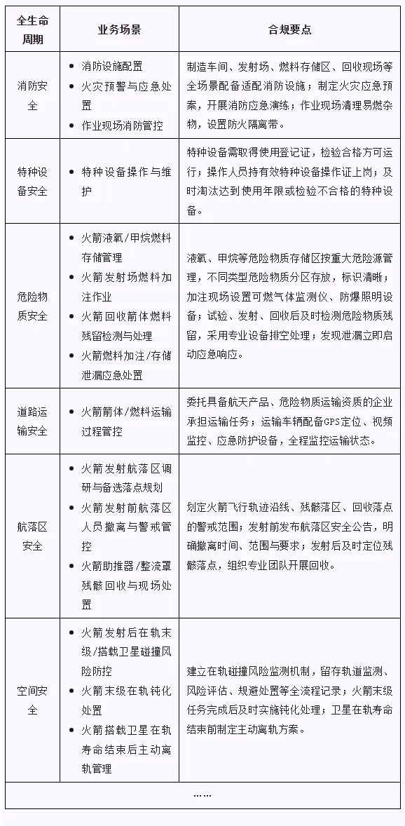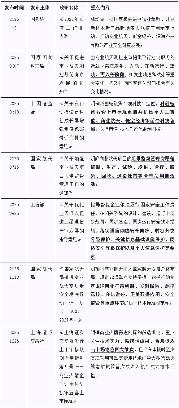 一、合规义务与风险识别2025年是我国商业航天的“政策密集落地年”,为商业火箭企业划定了“发展红线”“机遇窗口”之余,也指明了合规管理体系的建设方向。其中,与商业火箭企业密切相关的政策包括: