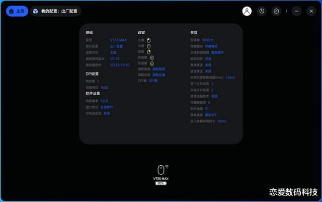 这三款鼠标中VT3和VT3S鼠标搭载的传感器是原相定制的3398(高定版3395),而VT3S MAX鼠标则搭载了更高一级的原相3950 Ultimate传感器,这三款鼠标X/Y轴均可独立设置,前两款鼠标静默高度在1-2mm距离内11档自由可调,步进高度0.1mm,指针灵敏度50-26000DPI,步进灵敏度50DPI,追踪速度650 IPS,加速度50G。后一款鼠标0.7-1.7mm距离内11档静默高度自由可调,步进高度0.1mm,指针灵敏度10-45000DPI,步进灵敏度10DPI,支持玻璃追踪技术,追踪速度750 IPS,加速度60G。