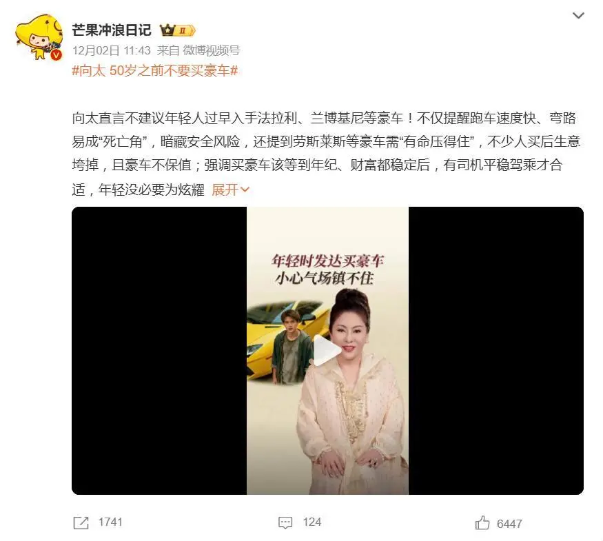 镜头里的向太穿着香槟金套装,手指敲着直播间桌面,语气斩钉截铁:“法拉利、兰博基尼那都是‘速度炸弹’,年轻人经验不足,弯道就是‘死亡角’”,话锋一转更抛出玄学暴击:“更重要的是压不住气场!我见过有人买了劳斯莱斯,生意反倒垮了,要有命享才行”。最后补的经济账更扎心:“豪车落地打五折,纯属移动碎钞机,图啥?”
