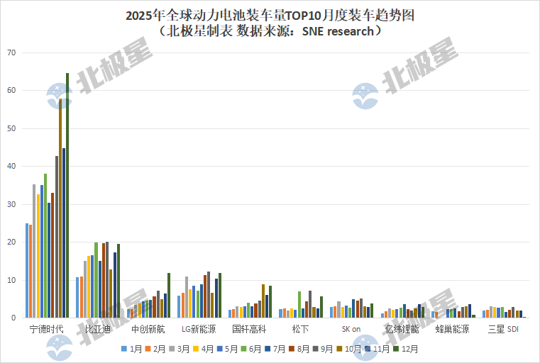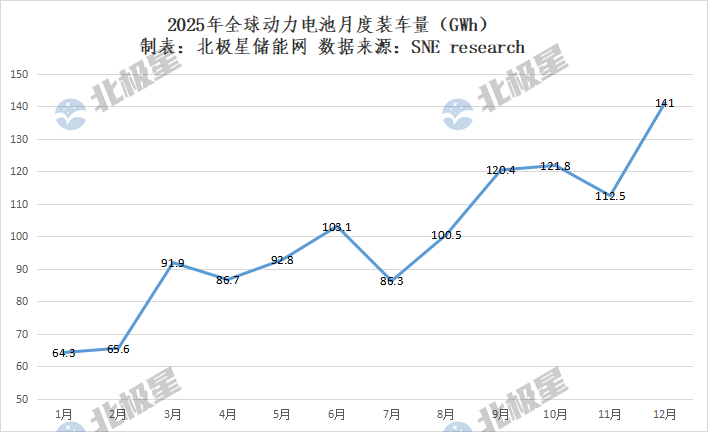北极星储能网获悉,2月4日,SNE research发布2025年1-12月全球动力电池装车量数据以及装车量企业TOP10排名,2025年全年全球动力电池装车量为1187GWh,同增31.7%。年底冲刺,12月单月动力电池装车量以141GWh达全年单月装车量最高值。