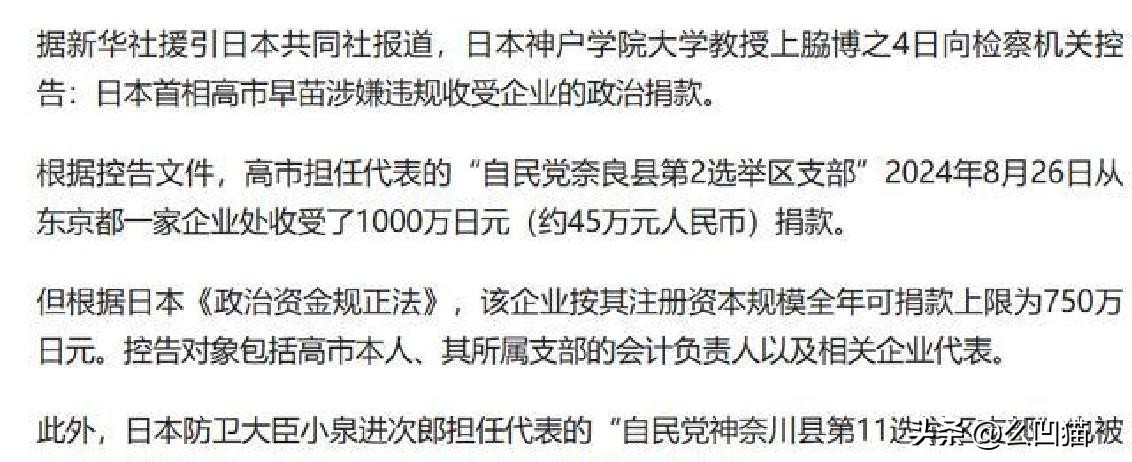 就在这种背景下,日本一位大学教授站出来,正式向检方举报高市早苗,说她收企业政治捐款超了规定的上限。按照现行规则,她从同一企业最多只能收七百五十万日元,但举报材料里提到的数额却是上千万日元。如果调查最后坐实,那就不是简单的“手续疏忽”,而是货真价实的金钱丑闻了。