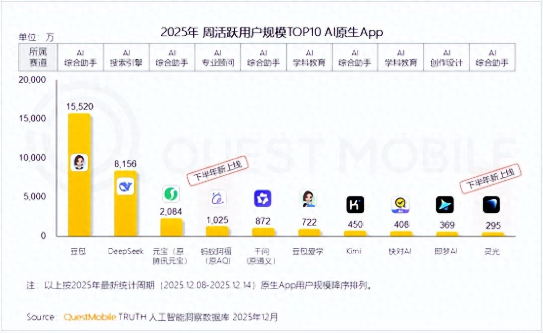 Quest Mobile发布AI应用排名:豆包、DeepSeek、元宝...