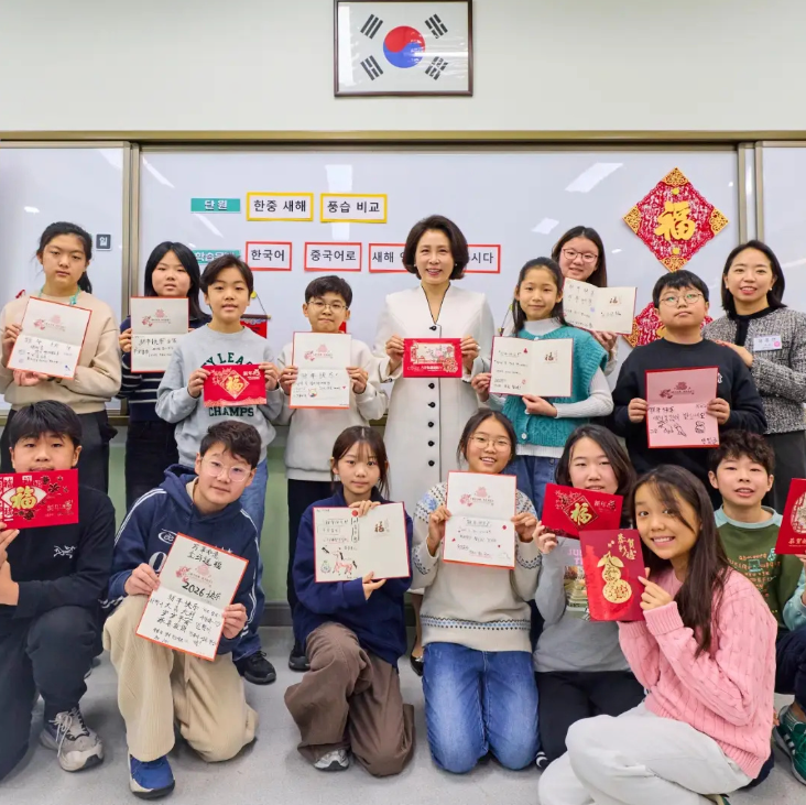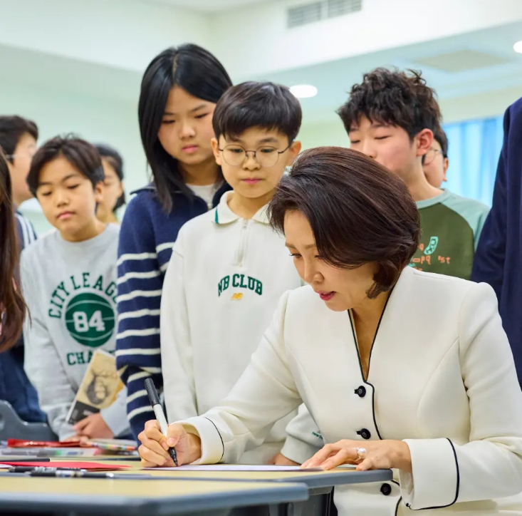 她坐在教室里和小学生互动,不知道是画画还是写着什么,韩第一夫人认真的样子很是亲切温柔,毕竟是孩子妈妈,因为她的孩子都是她一手带大,知道怎么和孩子互动交流。