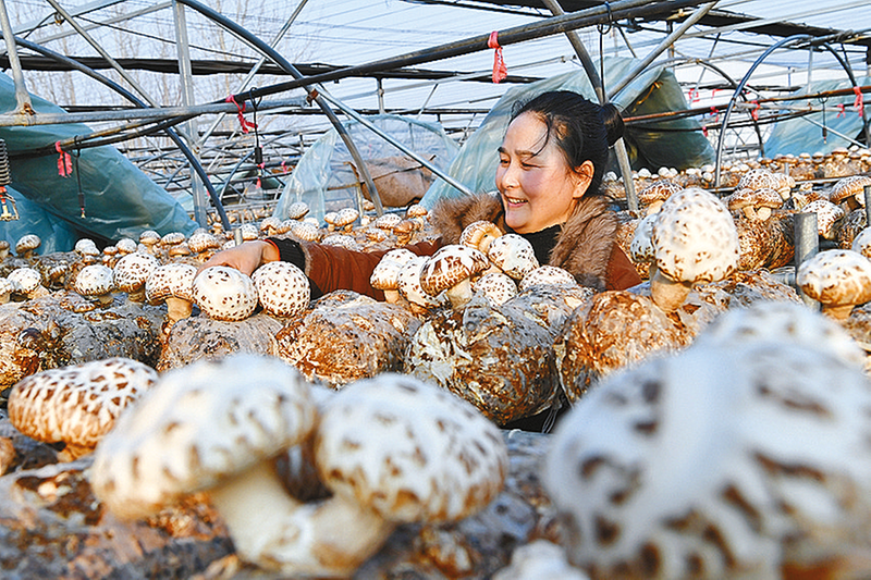 12月18日,位于杨家集镇的玉润农业科技有限公司食用菌大棚内,菌棒上的花菇长势喜人。