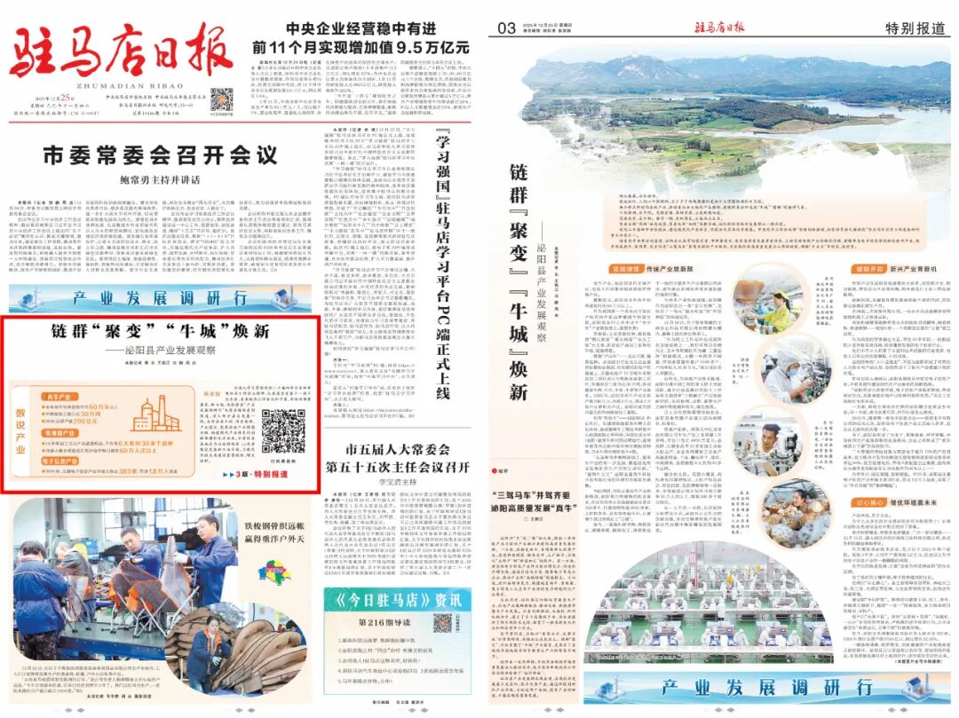 为深入学习贯彻党的二十届四中全会和中央经济工作会议精神,认真落实省委十一届十次全会、省委经济工作会议和市委、市政府部署要求,即日起,本报推出“产业发展调研行”大型全媒体系列报道,深入部分县区发展一线,走访企业车间、项目现场、产业园区,聚焦推动产业转型升级、构建现代产业体系的创新举措和扎实成效,全景记录各地全力以赴拼经济、心无旁骛促发展的生动实践,为现代化驻马店建设蓄势赋能、增光添彩。