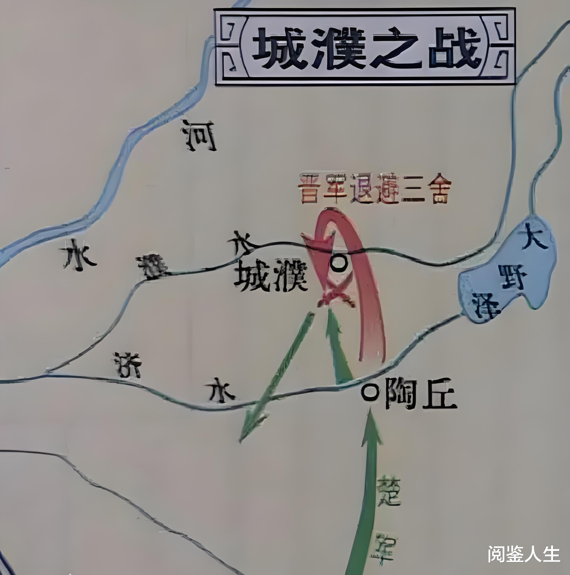 重耳流亡时曾受楚成王款待,当时承诺“日后若晋楚交战,必退三舍(一舍30里,三舍90里)”。