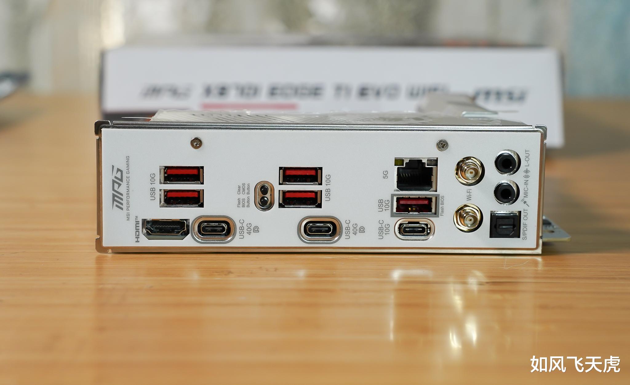 一体式IO接口也是非常丰富,底部左侧有一个HDMI 2.1接口,然后是2个40Gbps的USB 4.0 接口,右侧还有一个10Gbps的TYPE-C接口,所以一共有3个TYPE-C接口。上方有5个红色的USB接口,速率10Gbps,同时有2个按钮,分别是板刷BIOS按钮和清除BIOS按钮。这里还有一个有线网卡,速率高达5Gbps,2个无线天线接口,易插设计,板载内置无线芯片支持WiFi 7。最右侧是音频MIC IN和L-OUT接口,以及一个光纤输出接口。