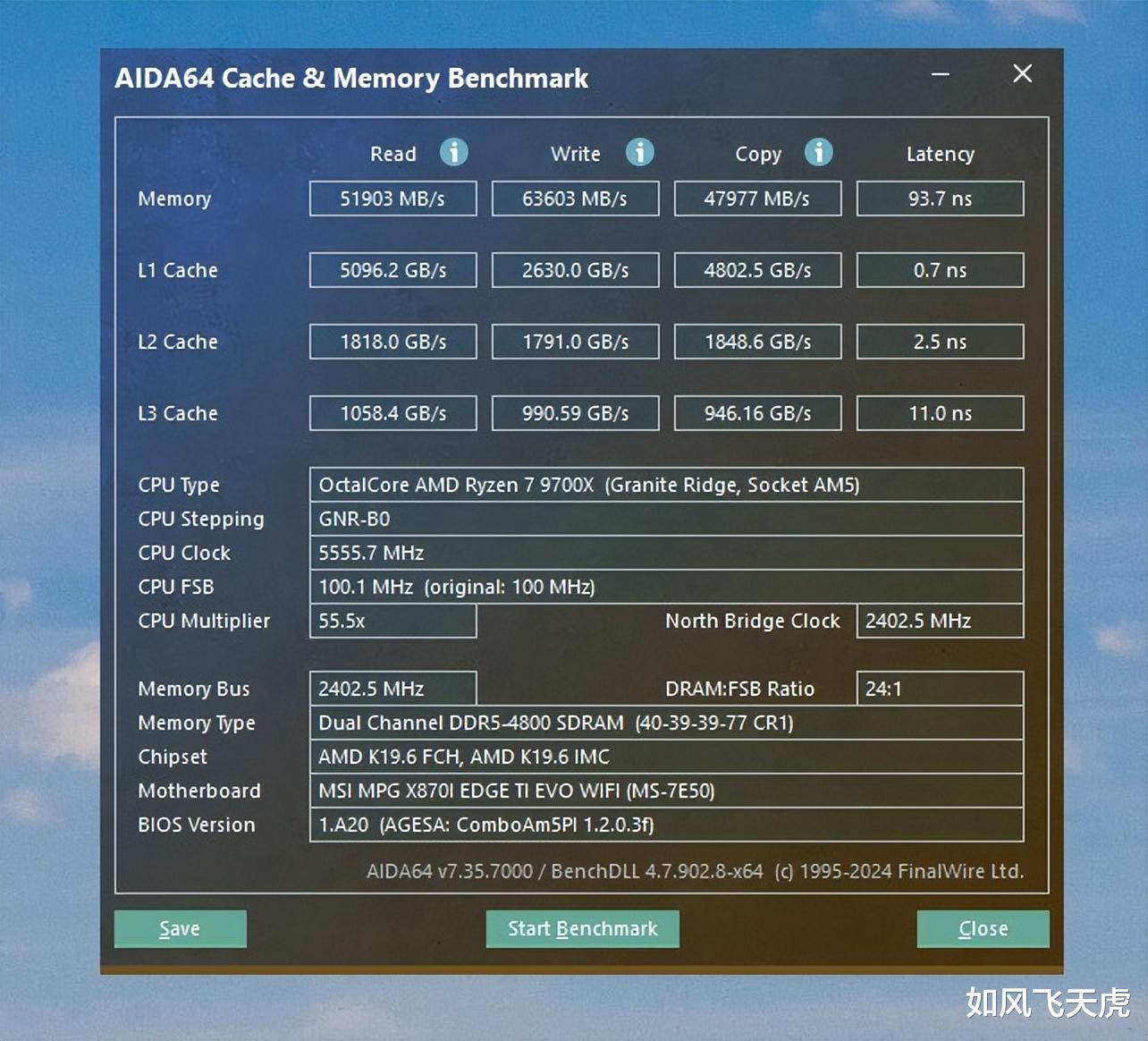 AIDA64内存测试,读取51903MB/s,写入63603MB/s,复制47977MB/s,延迟93.7ns。